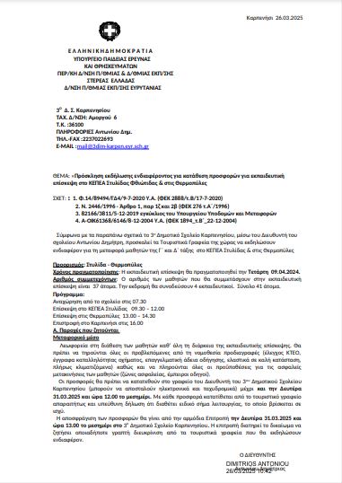 Πρόσκληση εκδήλωσης ενδιαφέροντος για κατάθεση προσφορών για εκπαιδευτική επίσκεψη στο ΚΕΠΕΑ Στυλίδας Φθιώτιδας & στις Θερμοπύλες